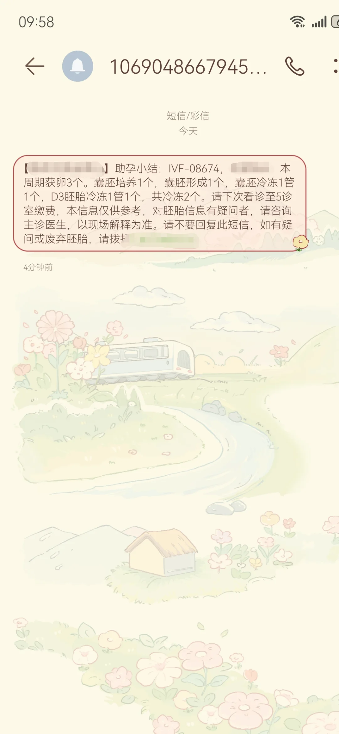 我都已经把养囊这个事情忘记了,刚刚突然收到短信,简直一个大开心。取了四次,每次都有四级,每次四级都养囊,前三次都失败,这次不抱希望,直接忘记了我有个四级送去养囊了,然后,然后,我就收到养囊成功的短信了!!!简直太开心了,我一个四级胚胎养囊